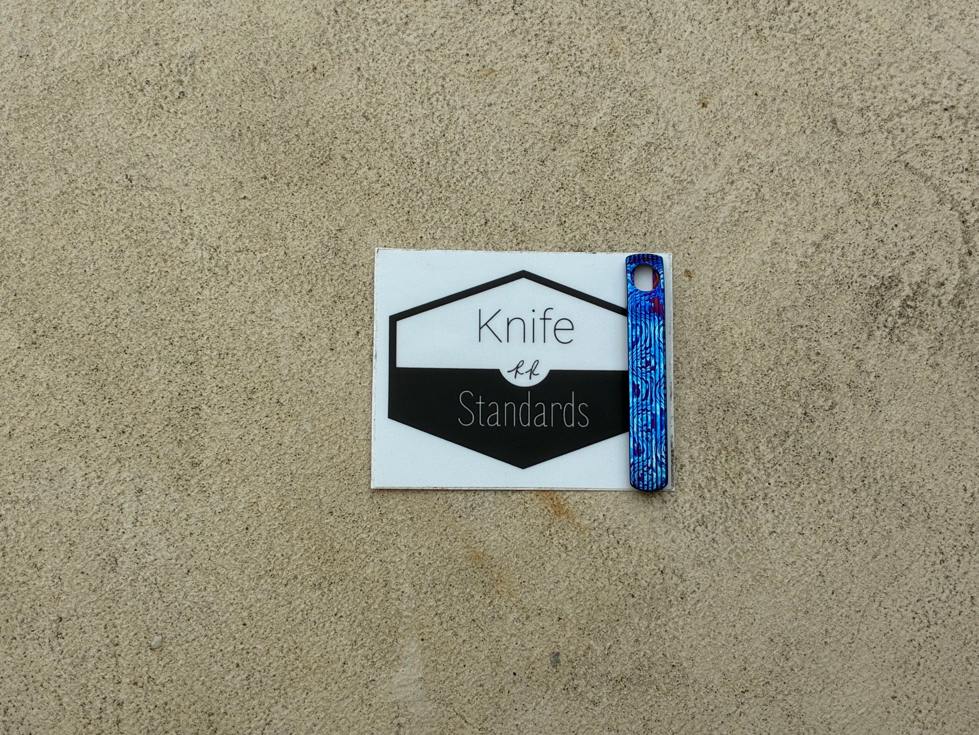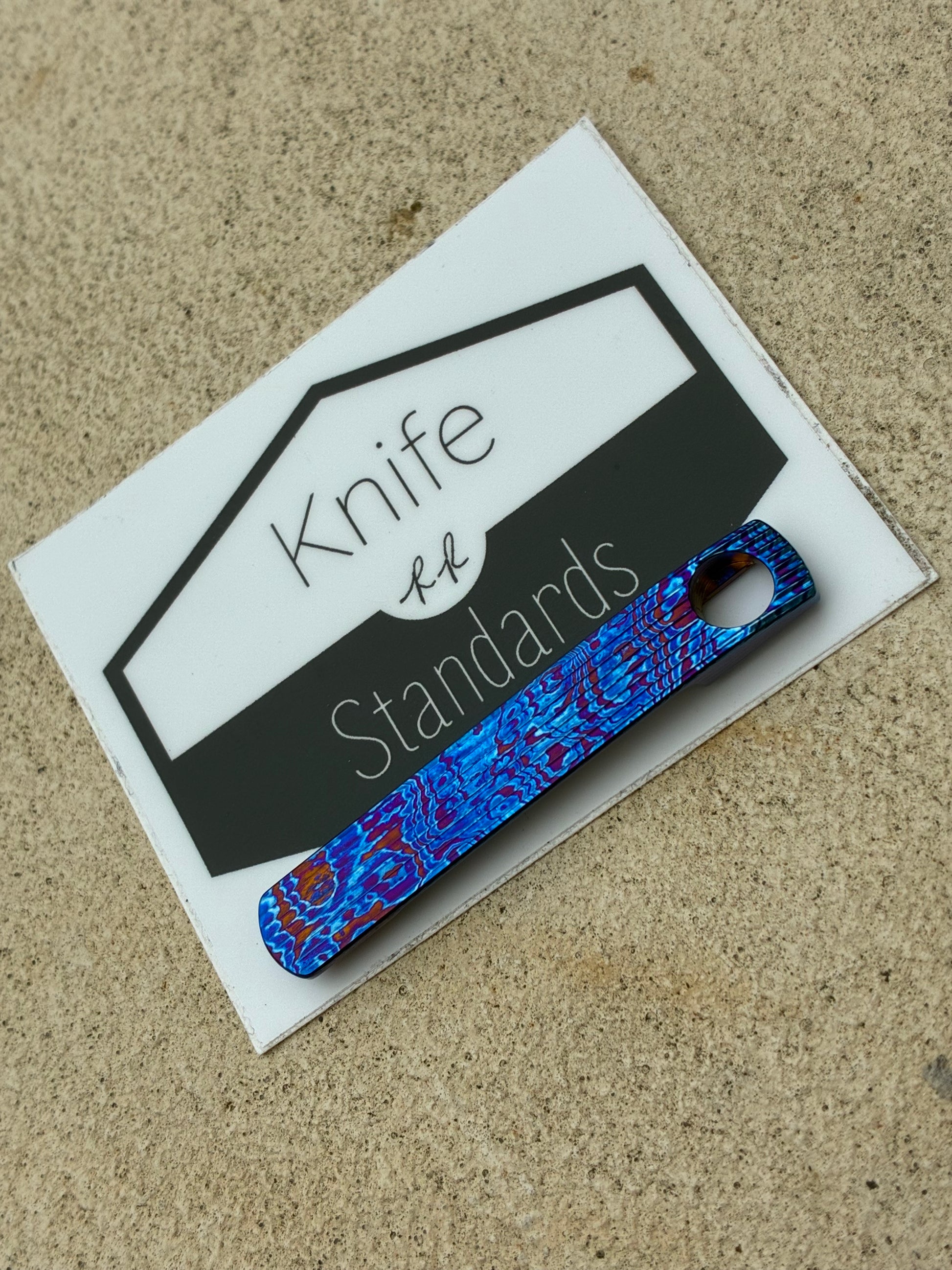 The Knife Standards Milled Titanium Clip in Timascus with vertical milling pattern. This Timascus clip is made specially to fit all Knife Standards models. Please note each Timascus pattern is unique