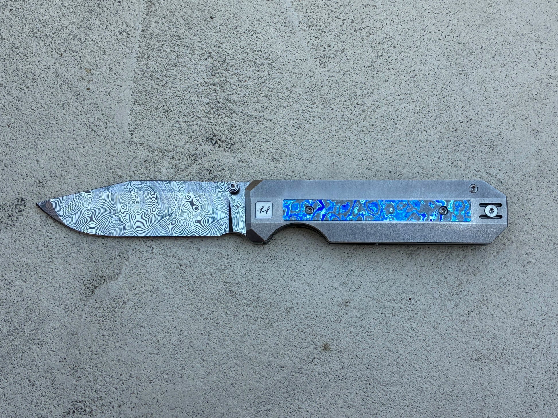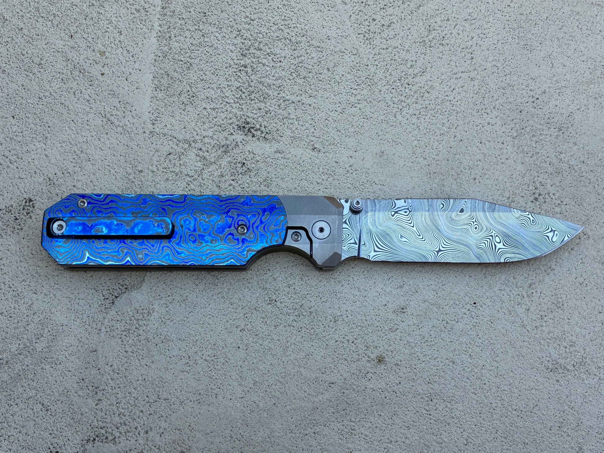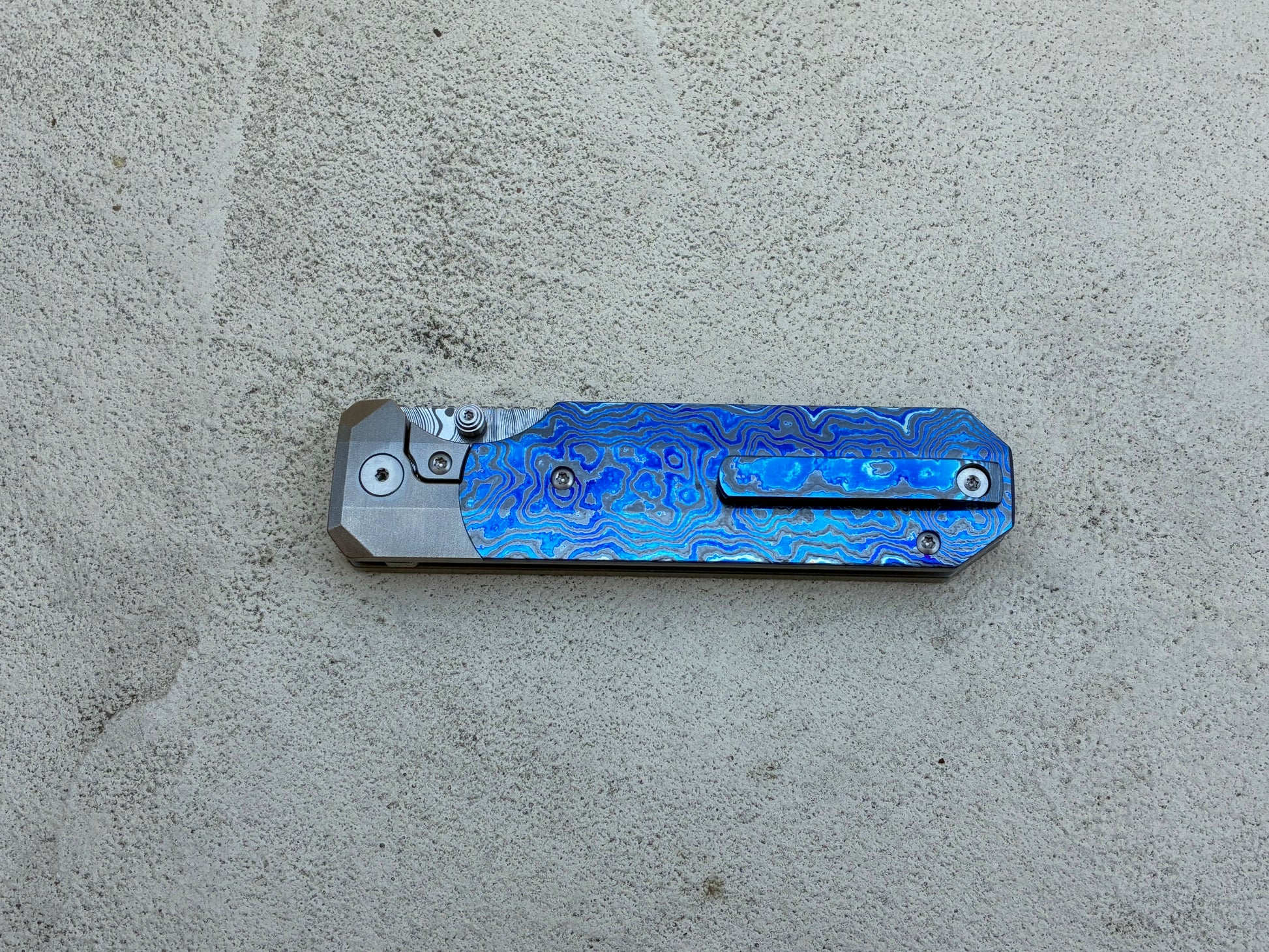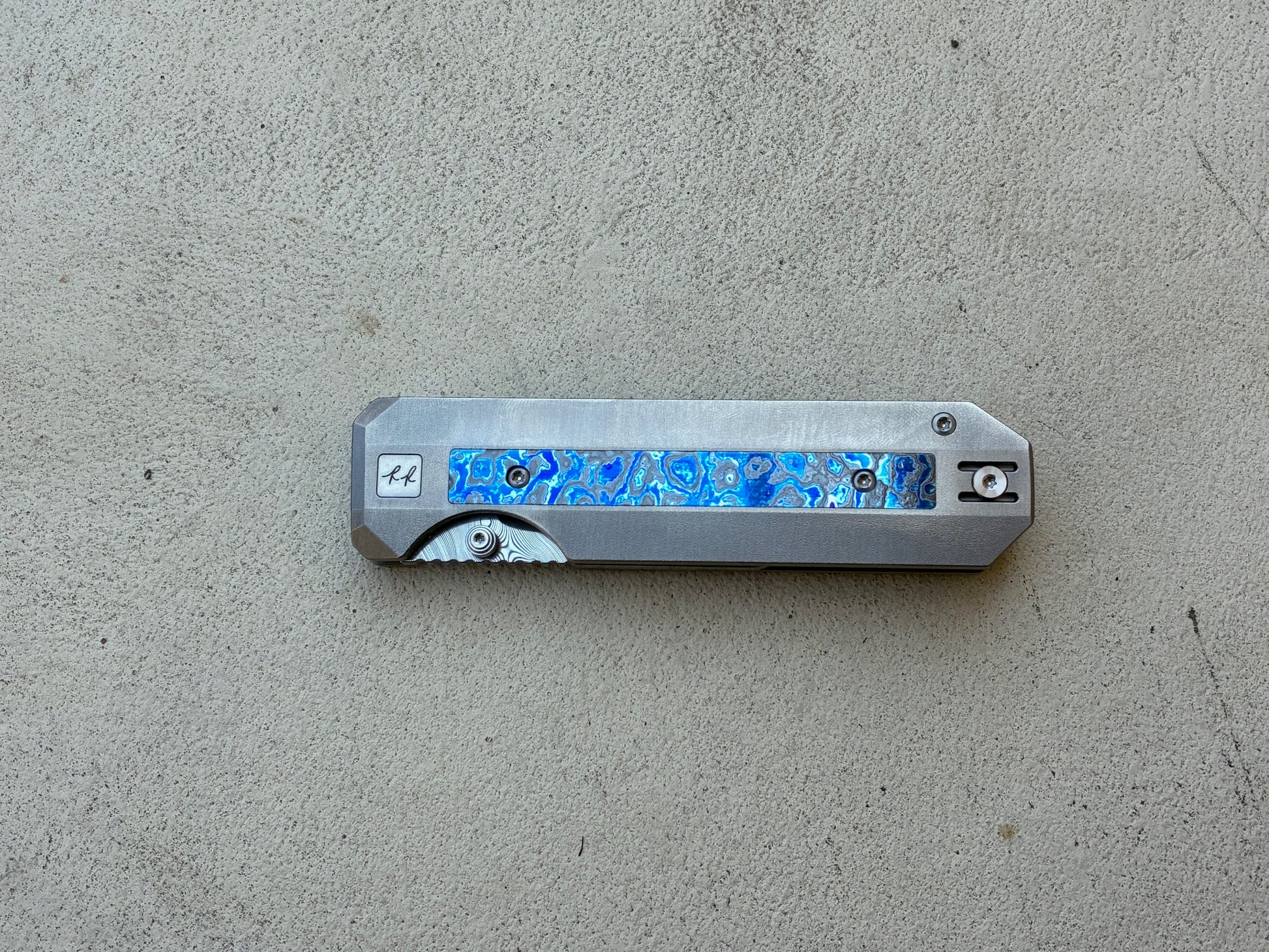 The RR Standard (+) in the Supreme variation. This is a very limited special edition with only 7 pieces produced. The RR Standard (+) Supreme features a hollow ground Bjorkmans Twist Damasteel blade, orange peeled titanium handles, dual Zircuti inlays, and a Zircuti milled pocket clip.